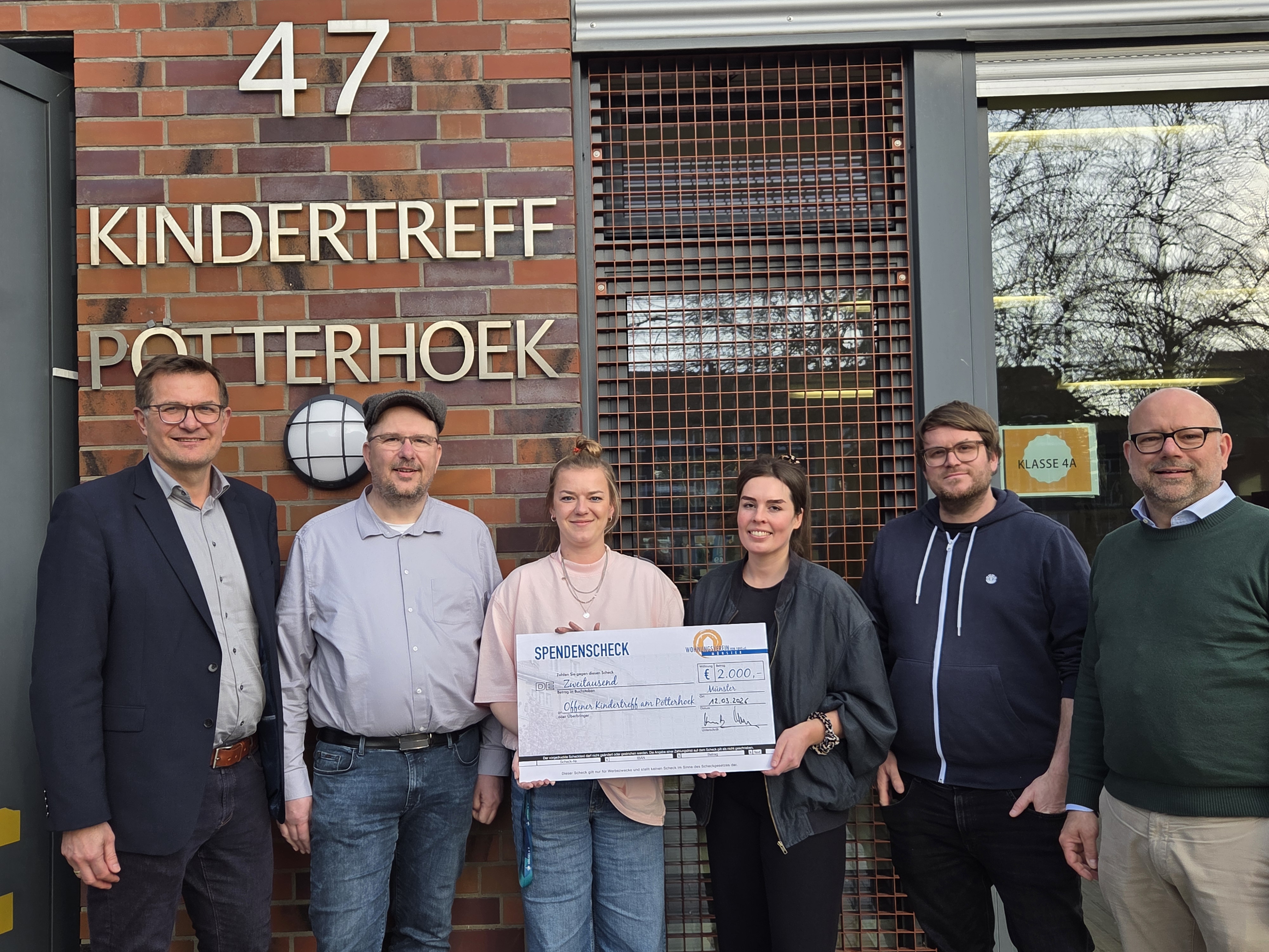 Mit einer Spende in Höhe von € 2.000,00 unterstützt der Wohnungsverein Münster von 1893 eG die Arbeit des Offenen Kindertreff Pötterhoek. Die Vorstandmitglieder André Schneemann und Markus Funk übergaben zu diesem Zweck einen symbolischen Scheck an Sonja Thewes und Julia Schönlau vom Team des Treffs. Christian Schöler-Koch und Joachim Lemke vertraten den Träger Kreisel e.V. aus Emsdetten.